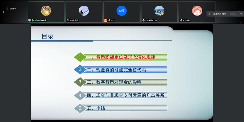 最后,司老师与参会师生就数字货币的发展进行了深入探讨。司老师认为数字货币功能定位还需要进一步明确,基础设施建设需要一定的周期,作为公共产品,普惠性需要重点保障,作为法定货币,法律层面需要进行配套。现金需求在短期内不可能被完全替代,仍在缓慢增长。而现金的应急储备功能更具现实意义,现金与非现金支付工具仍处于互相补充于替代的情况。现金还是信用度、安全性最高的支付工具。同时,她也认为随着技术的发展,数字货币与非现金支付会进一步取得进展,但短期内还是现金与相关数字支付、数字货币并存的时代。