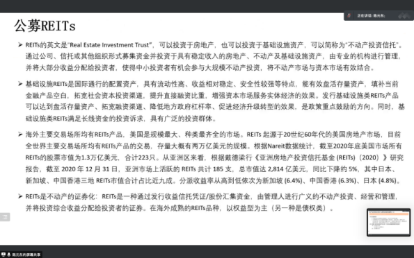 随后,陈老师又从项目资产类别、上市表现、近期政策支持方向三个角度给同学们详细介绍了公募REITs,并与类REITs进行了对比,让同学们对公募REITs有了较为全面的认识。